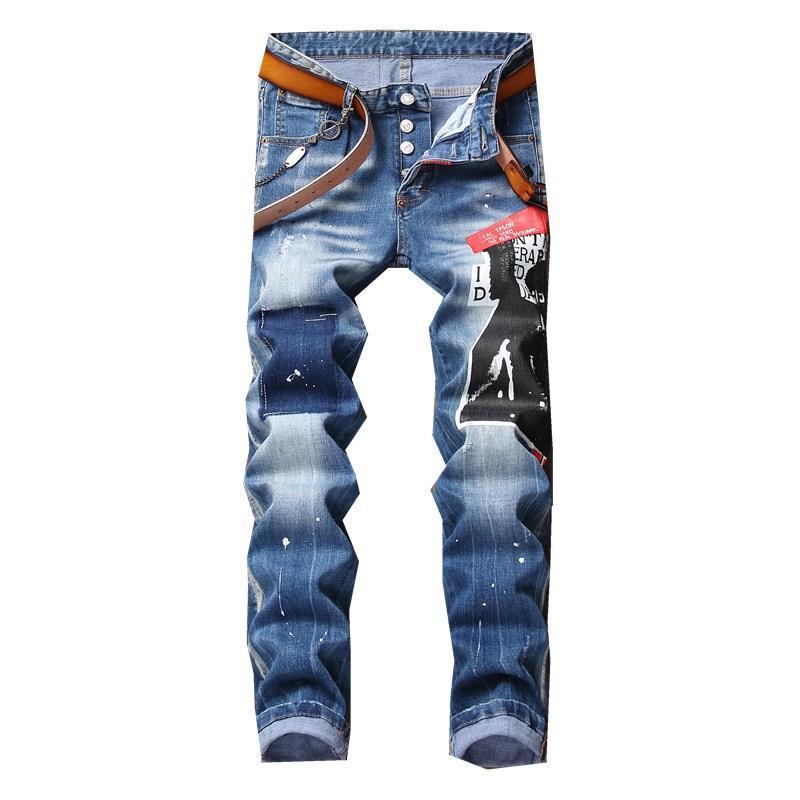 New Men jeans stretch printed ripped skinny jeans